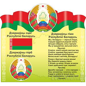Дополнительное описание: Стенд “Символика” содержит символы государственного суверенитета Республики Беларусь. Слева вверху расположены государственный флаг Республики Беларусь, который представляет собой две горизонтально расположенные, красную и зеленую, полосы и вертикально размещенный, красного цвета на белом фоне, белорусский национальный орнамент. Под флагом, слева, находится государственный герб, а справой стороны – национальный гимн республики.